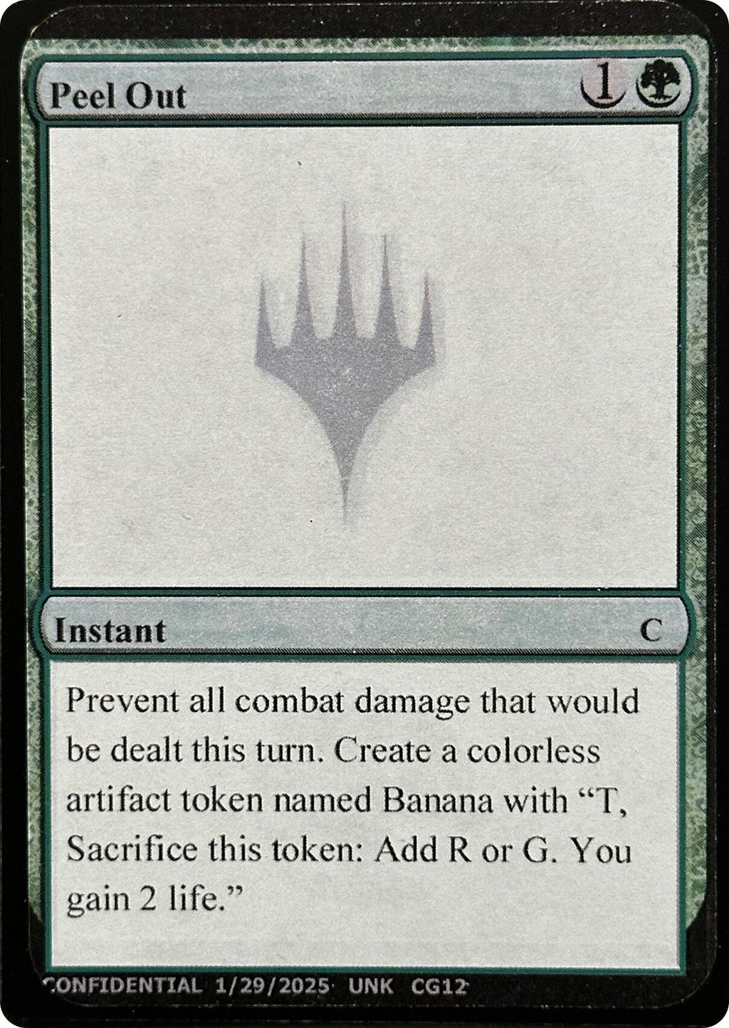 Prevent all combat damage that would be dealt this turn. Create a colorless artifact token named Banana with "{T}, Sacrifice this token: Add {R} or {G}. You gain 2 life."